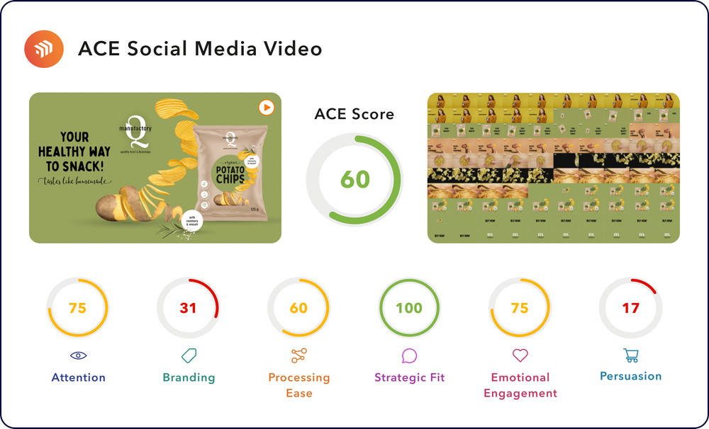 Brainsuite leverages neuroscience and AI to optimize creative asset performance across social media, predicting effectiveness based on Attention, Branding, Processing Ease, Strategic Fit, Emotional Engagement, and Persuasion